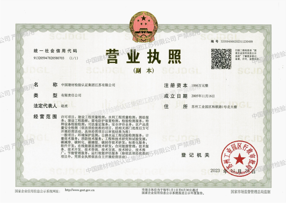 中國(guó)建材檢驗(yàn)認(rèn)證集團(tuán)江蘇有限公司,隸屬于國(guó)檢集團(tuán),總部位于蘇州工業(yè)園區(qū)和順路1號(hào),于2005年11月16日成立,試驗(yàn)室面積約11000平方。