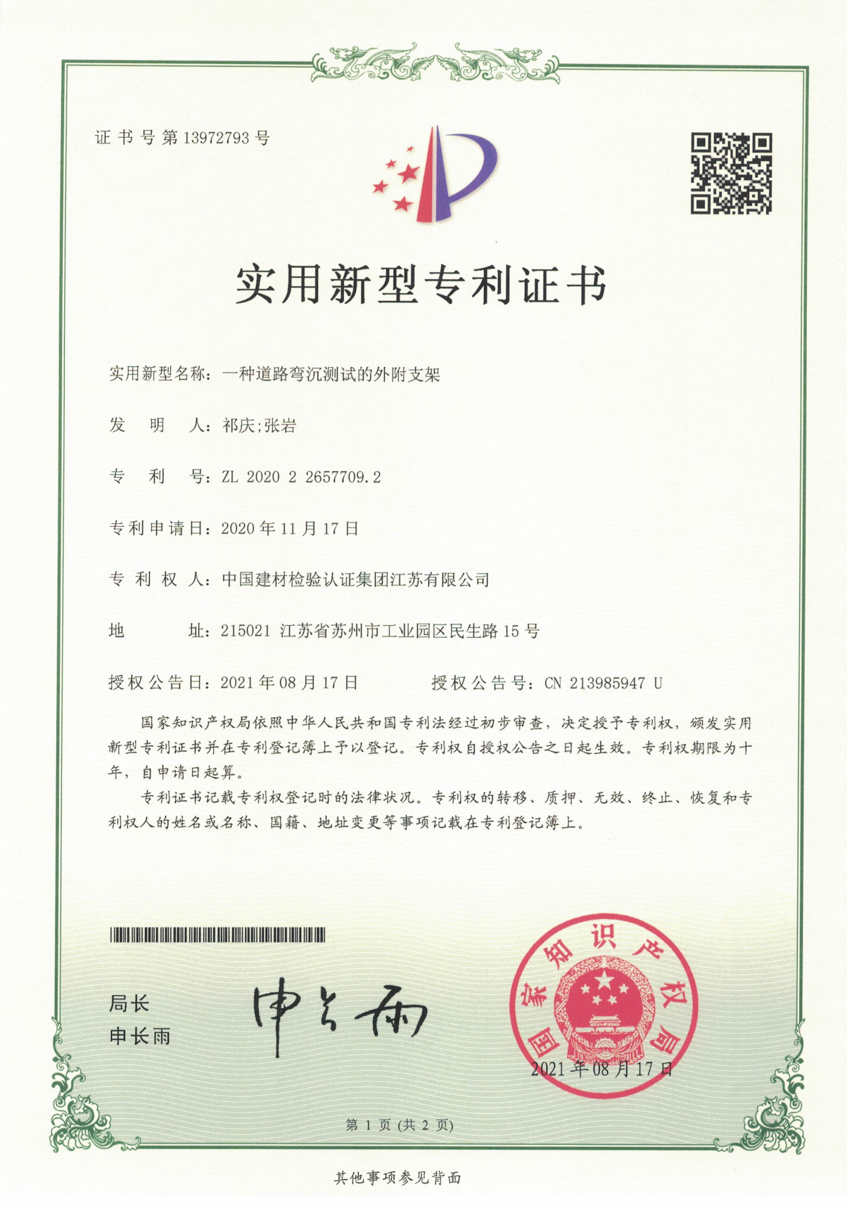 專利名稱:一種道路彎沉測試的外附支架 專利權人:中國建材檢驗認證集團江蘇有限公司 時間:2021-08-17