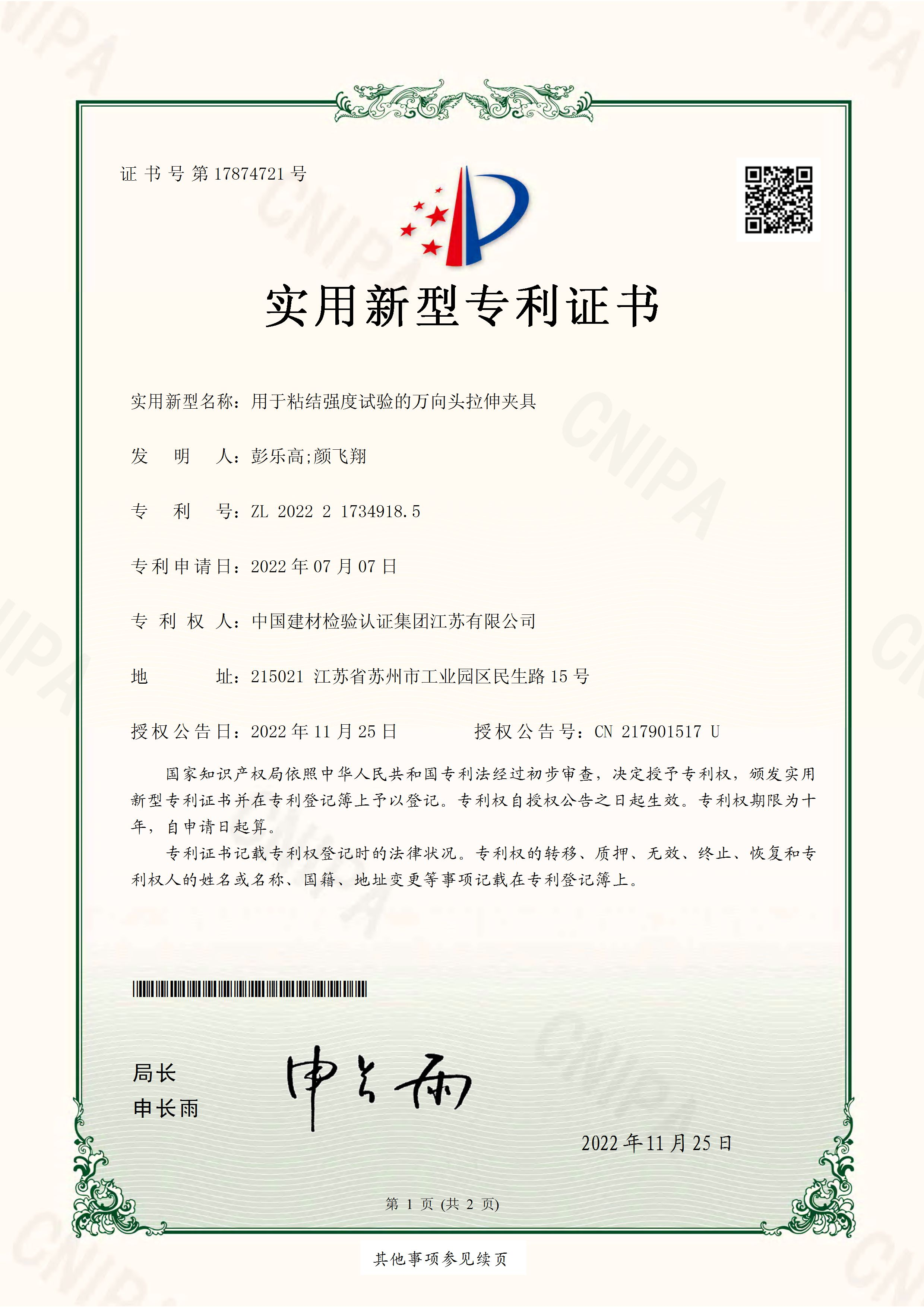 專利權(quán)人:中國(guó)建材檢驗(yàn)認(rèn)證集團(tuán)江蘇有限公司