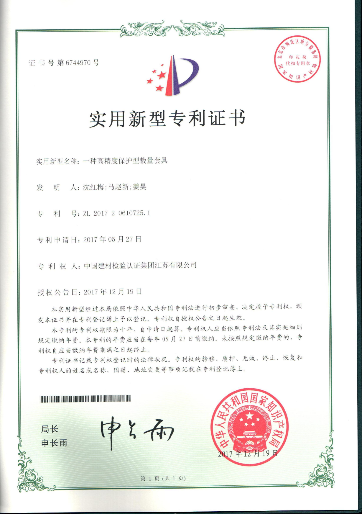 專利名稱:一種高精度保護型裁量套具 專利權人:中國建材檢驗認證集團江蘇有限公司 時間:2017-12-19